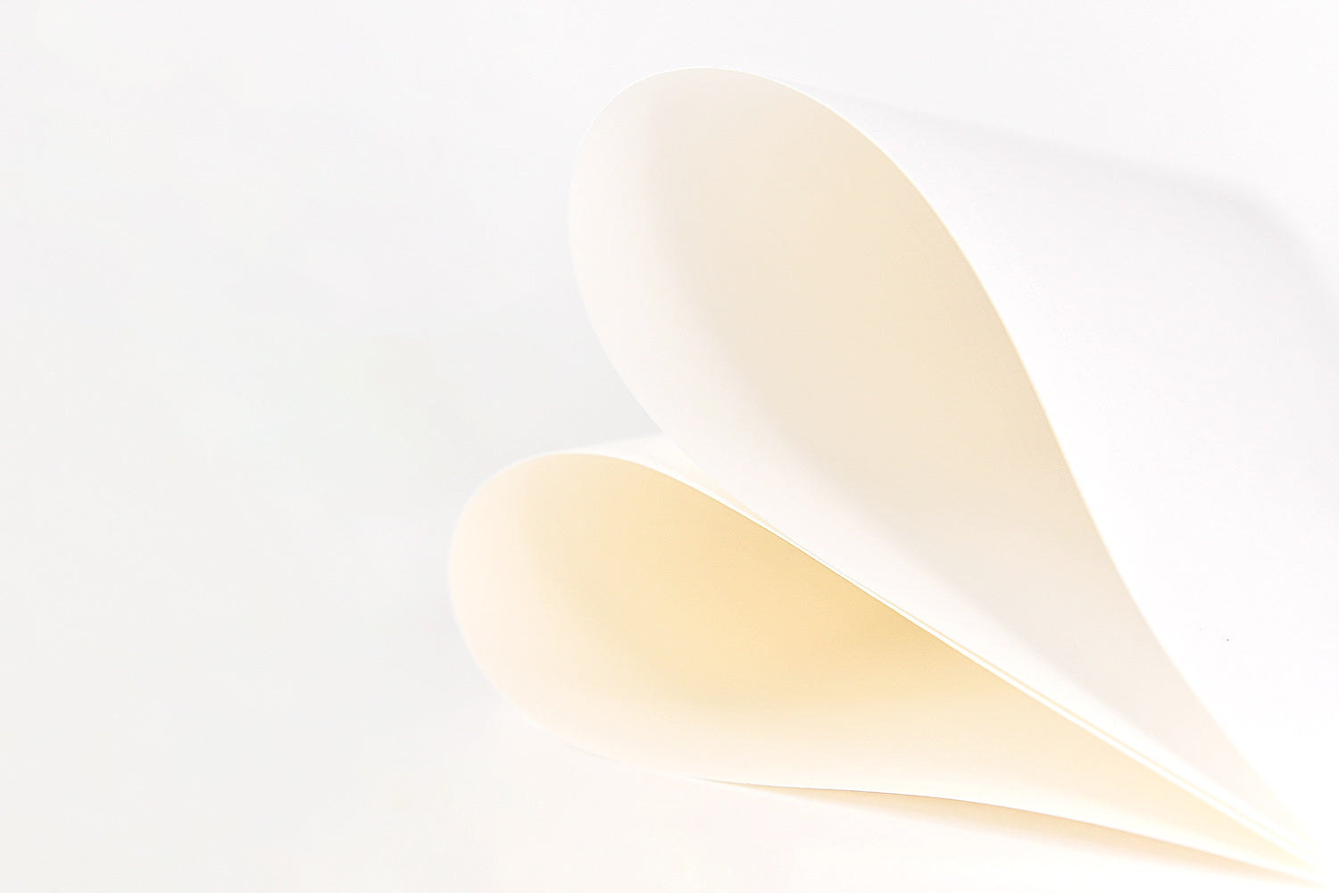 Nahaufnahme eines einzelnen weißen Blattes Papier, das teilweise auf einer flachen weißen Oberfläche aufgerollt ist.