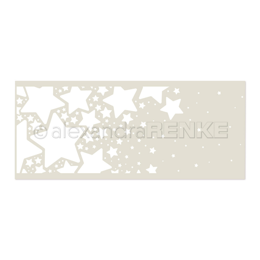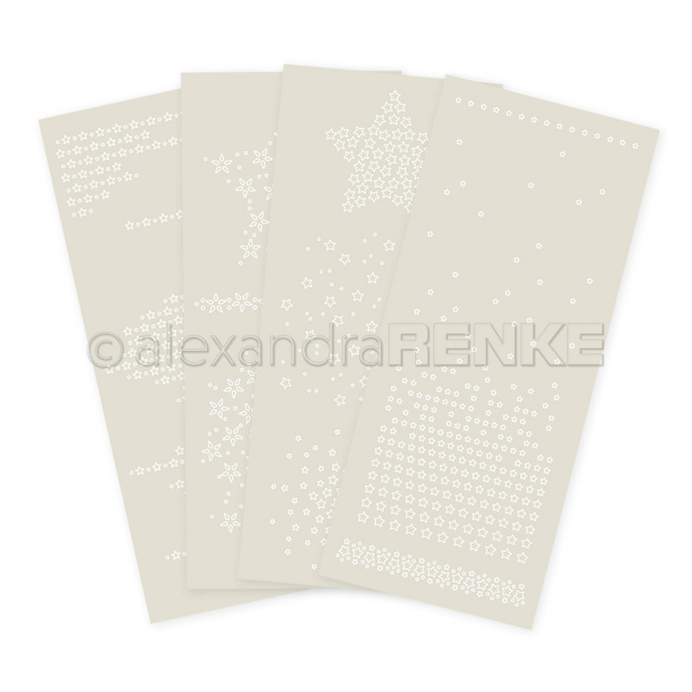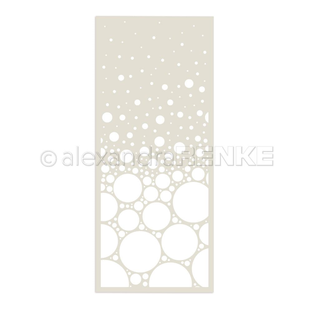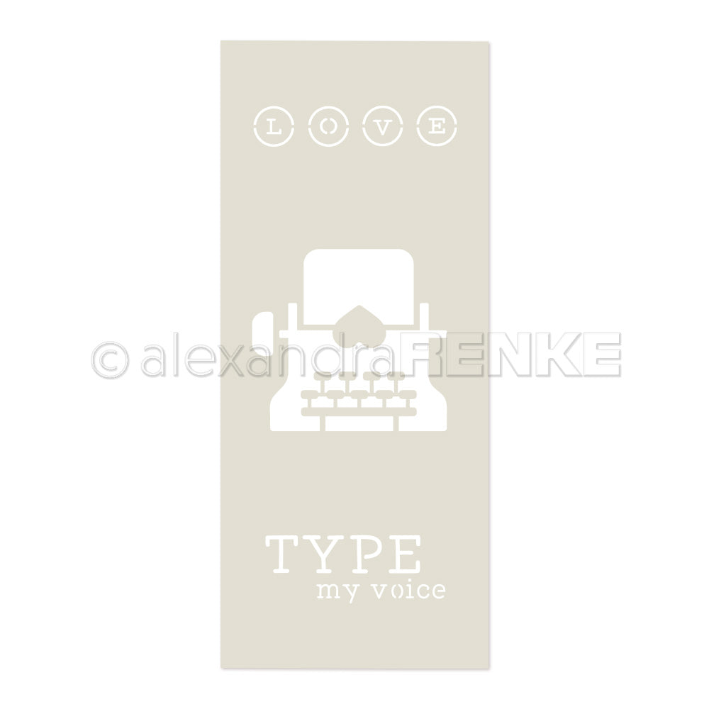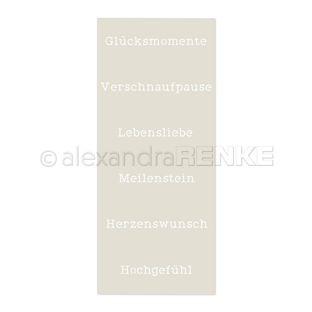 Beige Karte von Alexandra Renke mit deutschen Sprüchen in weißer Schrift wie "Wundertüte" und "Geburtstagskind", gestaltet mit Kreativität und eleganten Schablonen.