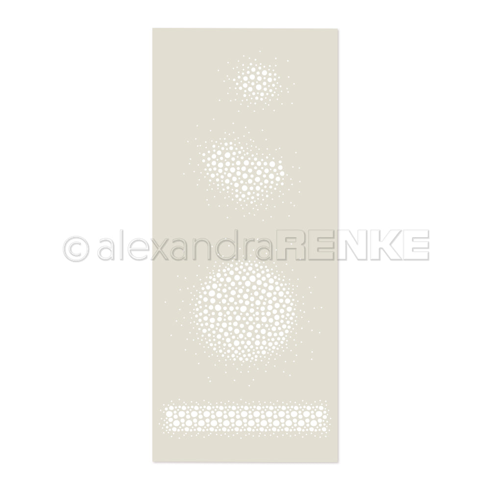 Cremefarbener Hintergrund mit weißen Hängeornamenten und Schleifen in verschiedenen Größen, vertikal angeordnet - ideal als Alexandra Renke Weihnachtsschablone, wiederverwendbar für festliche Christbaumkugeldekorationen.