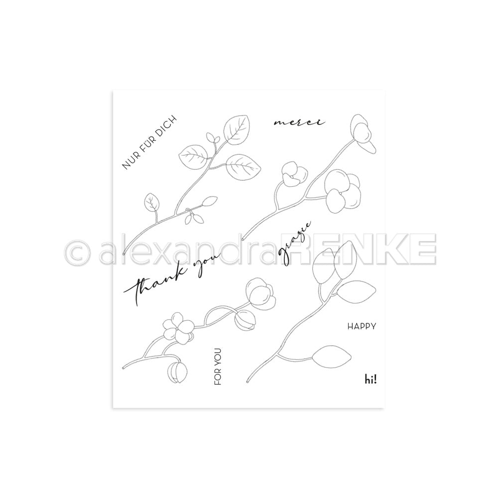 Mit unserem Clear Stamp Set 'Blumenzweige Merci' könnt ihr wundervolle Akzente setzen oder Eure Papierprojekte mit detailreichen Motiven und Grüßen ausstatten.