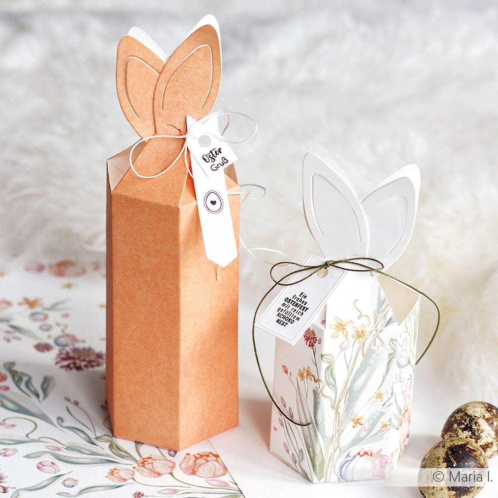 Mit unserer Motivstanze 'Schachtel Hasenohren' lassen sich in Kombination mit unserem Papier, unseren Stempeln, wie auch Sticker-Streifen wundervolle Akzente setzen.